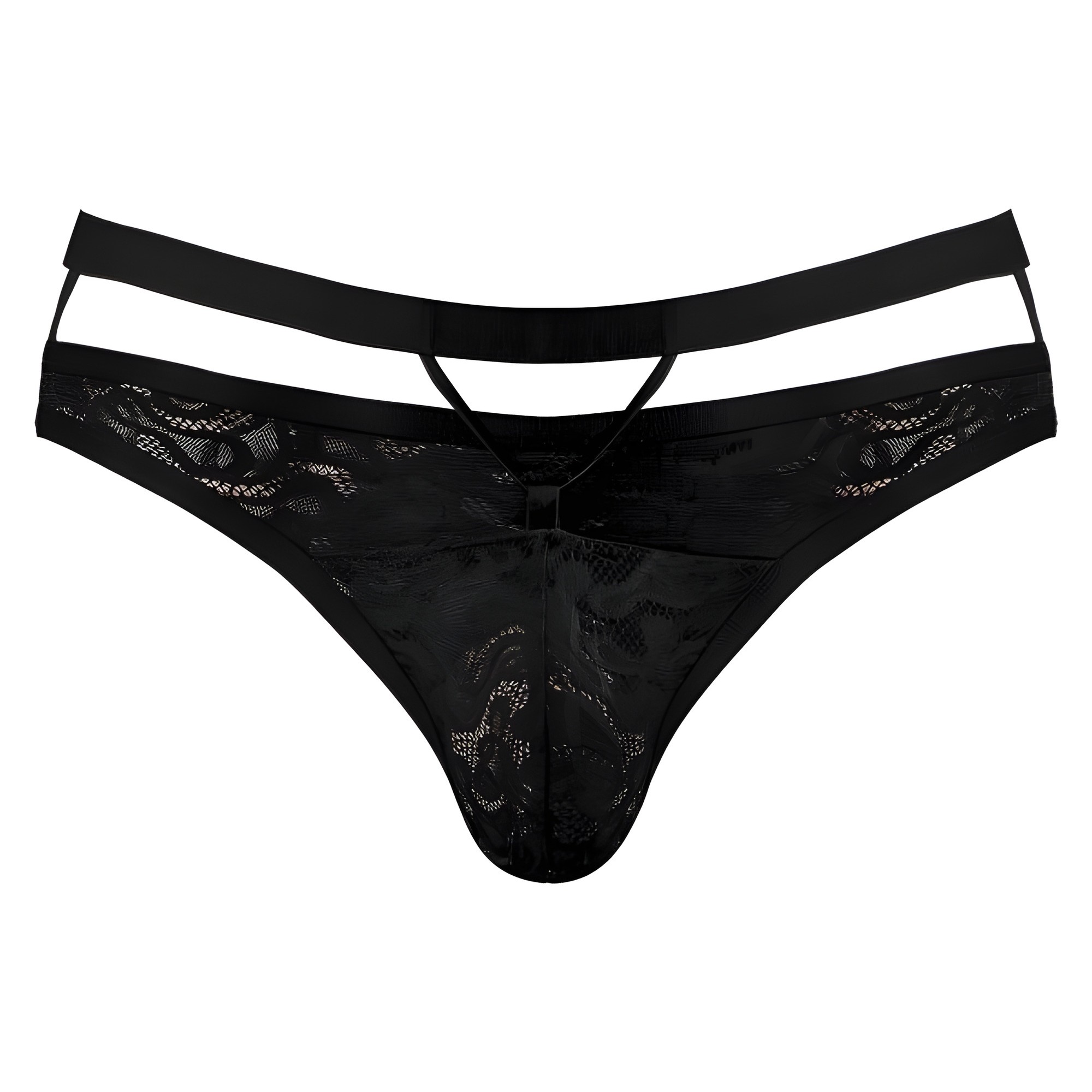 Featuring a unique cutout design and full lace pouch, this thong is both daring and comfortable.