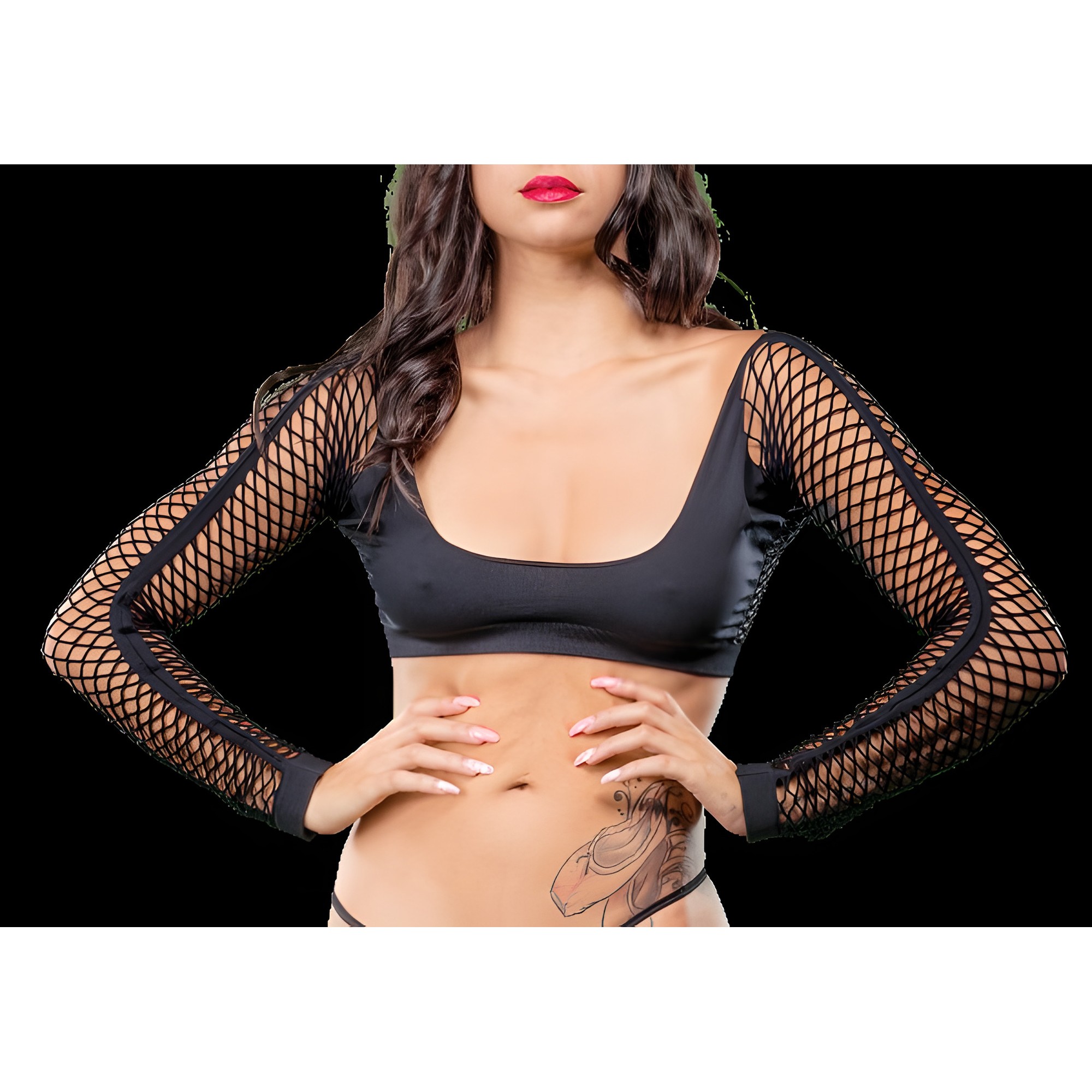 Haz una declaración audaz con nuestro Legging Negro de Malla/Fishnet Sin Entrepierna.