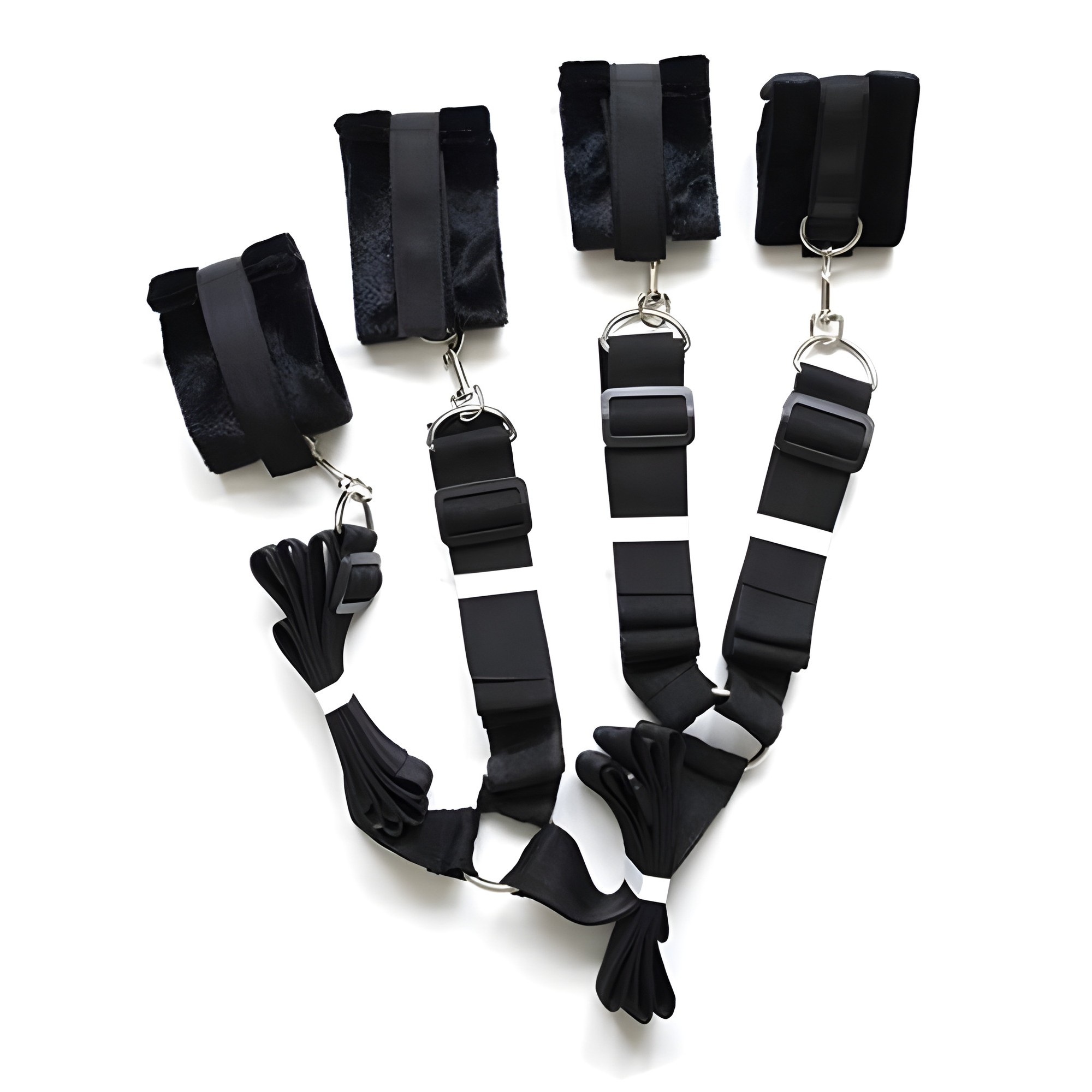 Este kit incluye grilletes cómodos y accesorios que te permiten explorar tus fantasías sin necesidad de postes de cama.